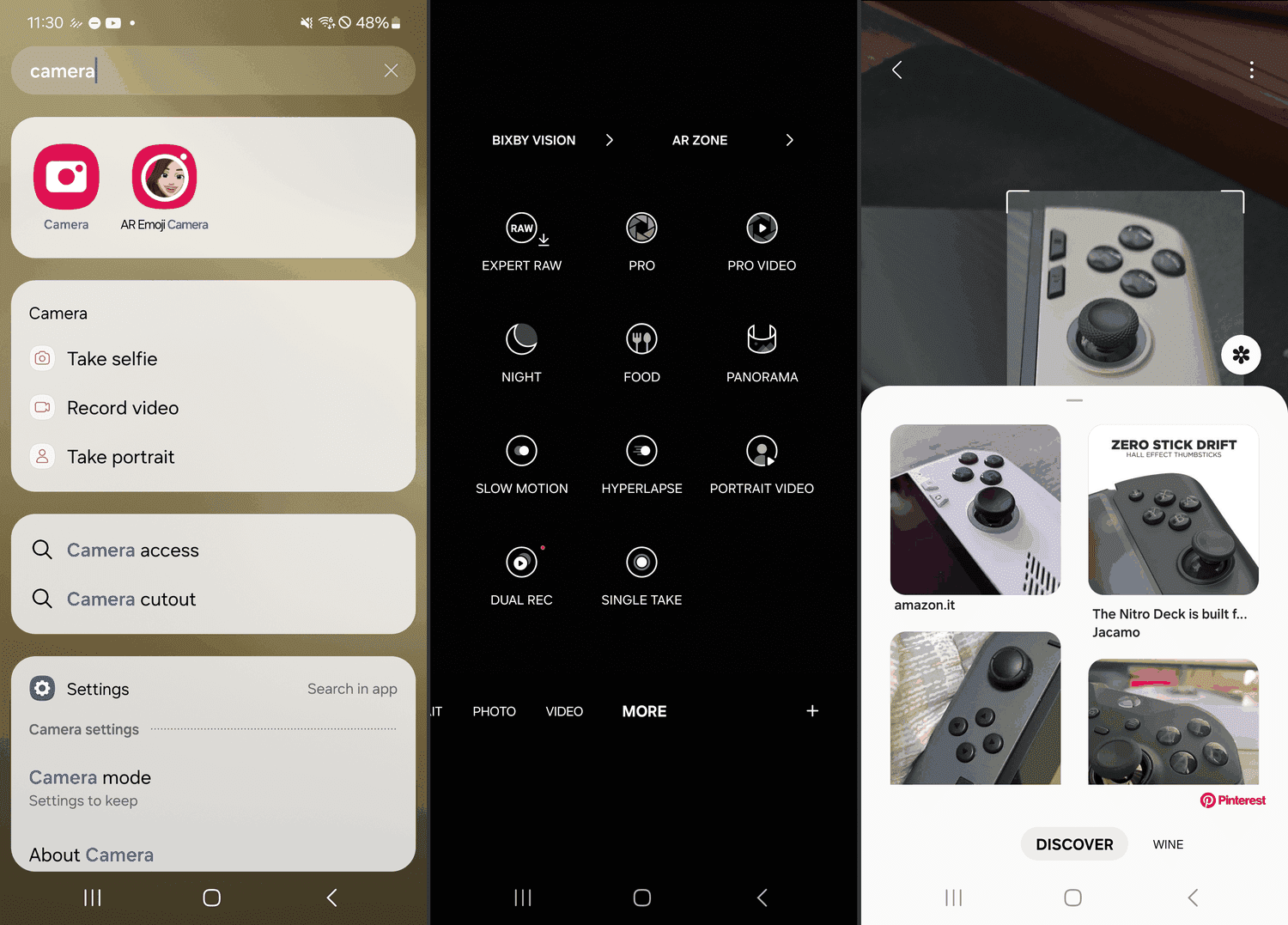 Select Discover at the bottom of the Camera app, and then point the camera at any object. Bixby Vision displays similar images it finds online. This is particularly useful if you're not sure how to describe something that you want more information about.