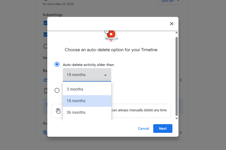 After that, you can choose to enable Google's Auto-delete controls, which wipe your search history periodically. Go to the My Activity page and select Auto-delete. Choose Auto-delete activity older than and pick either three months, 18 months, or 36 months.