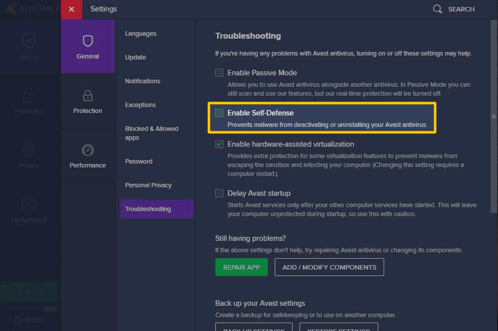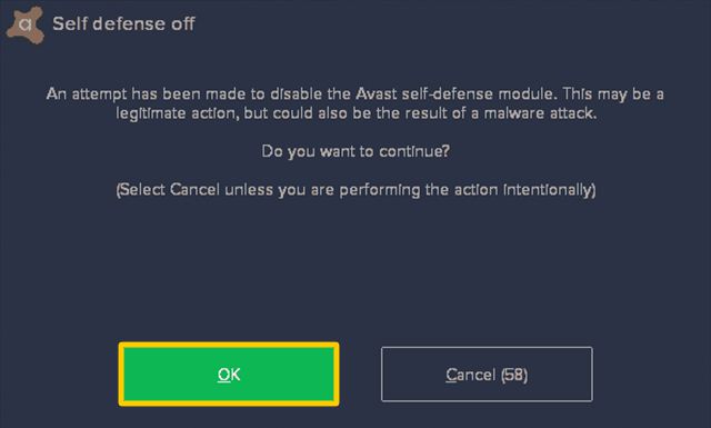 To disable self-defense mode in Avast, you'll need to go into a 'hidden' area of the Settings.