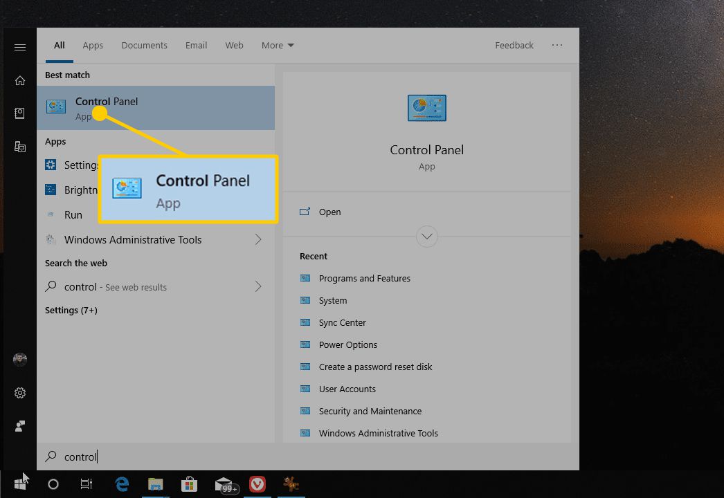 Open Control Panel. One quick method is to search for it from the Start menu; select Control Panel to open it.