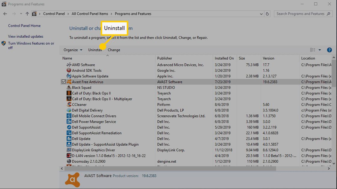 - Then, remove Avast: Control Panel > Programs and Features > highlight the app > Uninstall.