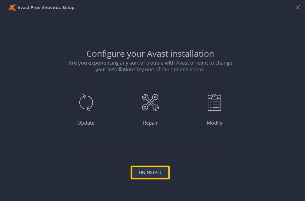 - When Avast's configuration screen appears, choose Uninstall and follow the on-screen directions.