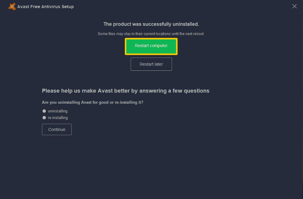 Restarting your computer will complete the uninstallation process. Once this is done, Avast will be completely uninstalled from your system.