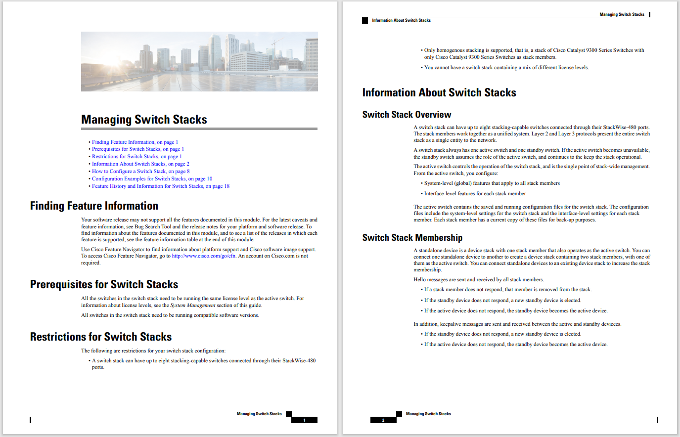 Download the guide book from Cisco: Managing Switch Stacks.pdf Managing Switch Stacks • Finding Feature Information, on page 1 • Prerequisites for Switch Stacks, on page 1 • Restrictions for Switch Stacks, on page 1 • Information About Switch Stacks, on page 2 • How to Configure a Switch Stack, on page 8 • Configuration Examples for Switch Stacks, on page 10 • Feature History and Information for Switch Stacks, on page 18 cisco 9300 stacking configuration