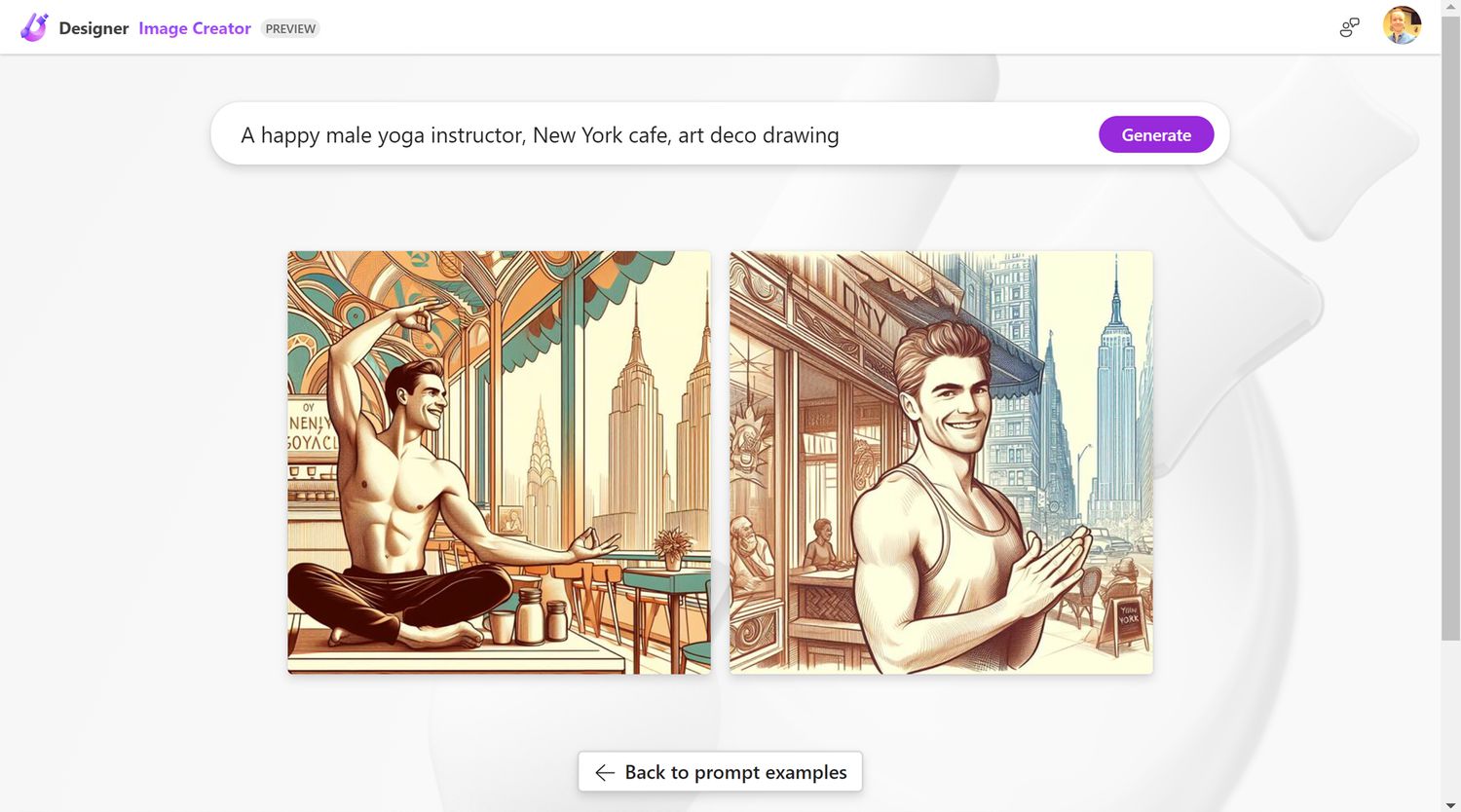 Enter your AI image creation prompt in the form of descriptive keywords and phrases separated by commas. For this example, we'll use "A happy male yoga instructor, New York cafe, art deco design."