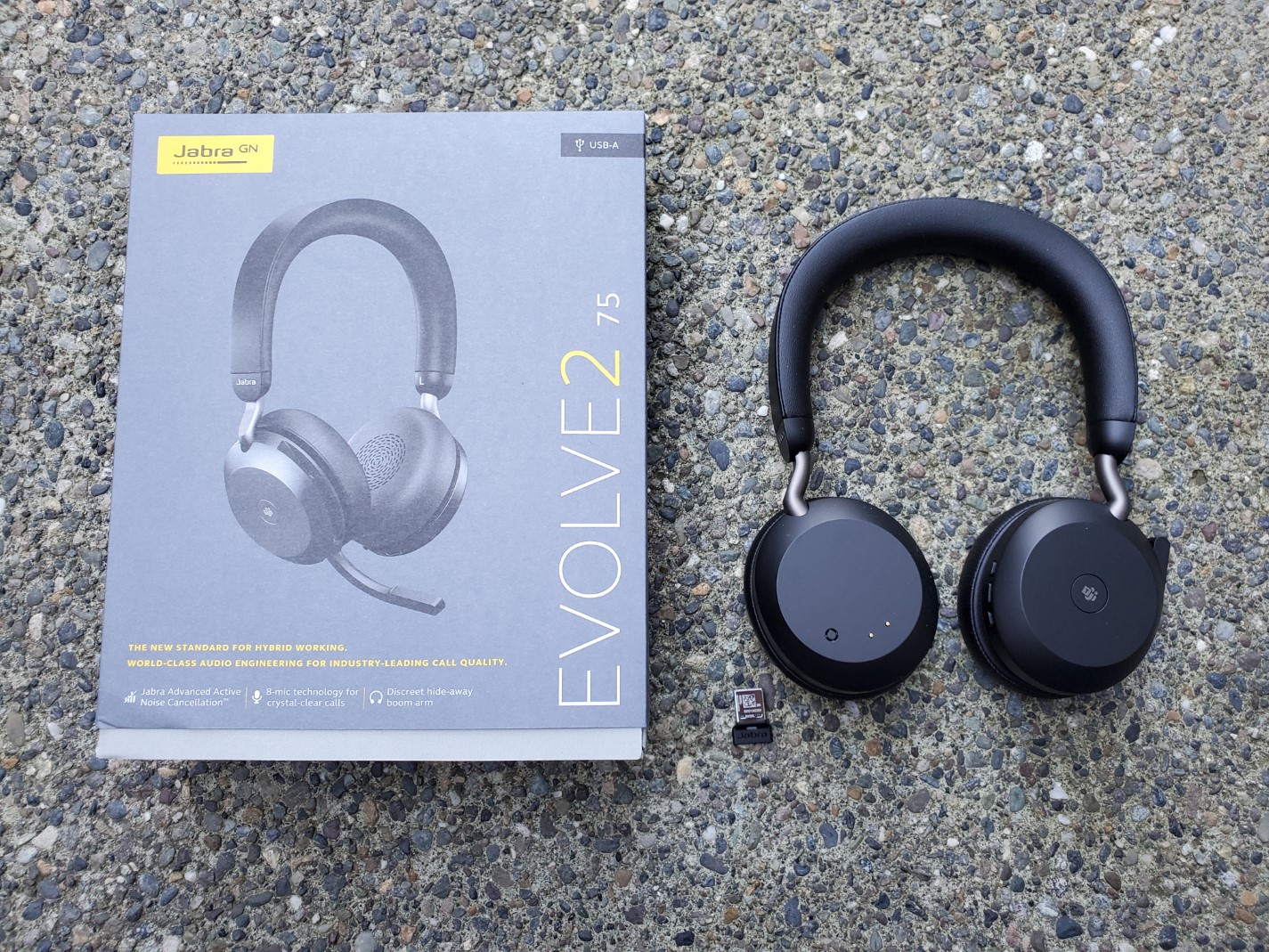 You can purchase the Evolve2 75 with either USB-A or USB-C support. This designation indicates which type of Jabra Link adapter is included in the package. Given that I use a Surface Pro 6 as my primary work computer, I tested the USB-A version. At first I didn't think it was included in the case, but found it hidden in the carrying case in a small compartment. You need this adapter to enjoy the full functionality of the Jabra Direct computer software. You could connect to your PC directly through Bluetooth without the adapter, but your experience would be limited and not as reliable.