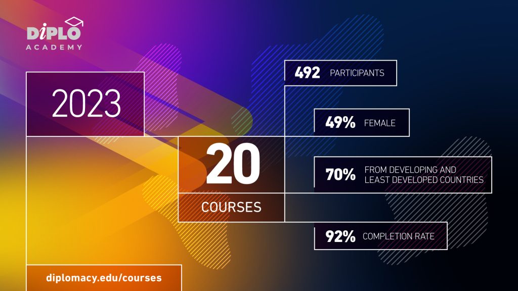 Diplo Academy, a trailblazer in digital policy and diplomacy online training, has achieved excellent results in the field of e-learning in 2023. The academy orchestrated 20 courses, boasting a noteworthy 92% course completion rate, attended by 492 participants. A commitment to inclusivity is evident, with 49% of female participants and a substantial 70% hailing from developing and least developed countries.