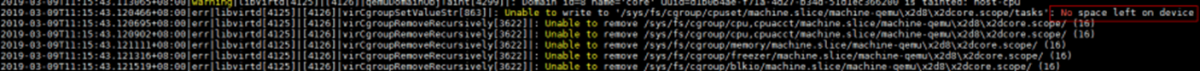 Key log: Unable to write to '/sys/fs/cgroup/cpuset/machine.slice/machine-qemu\x2d8\x2dcore.scope/tasks': No space left on device