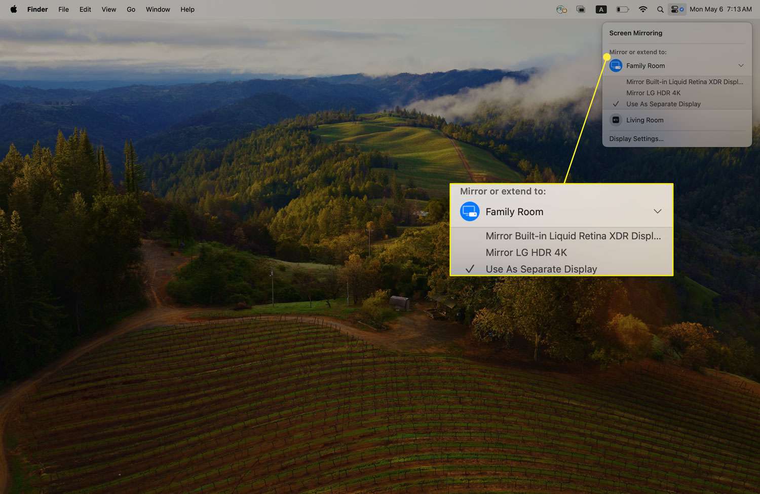Choose the arrow beside the connected TV to control the mirroring or separate display options.
