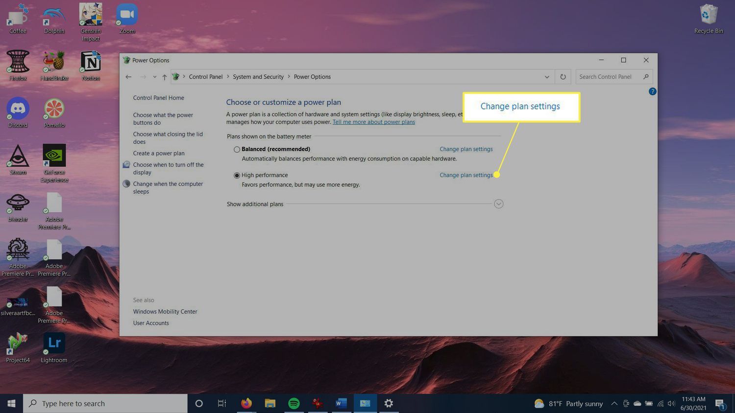 - Then, select Change plan settings next to the active plan. Change the timer for the display and/or sleep option.