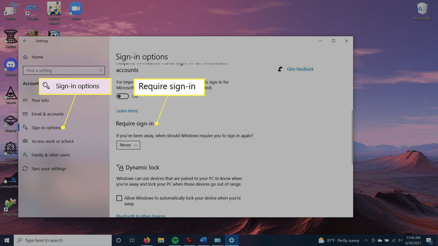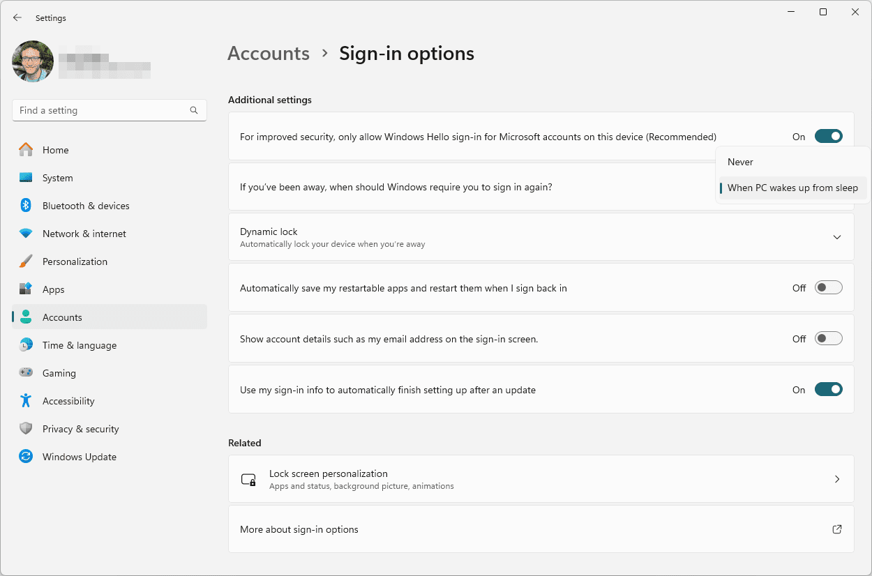 Select the menu next to If you've been away, when should Windows require you to sign in again? and choose Never. Now you won't have to sign back into your computer when you wake it from sleep.