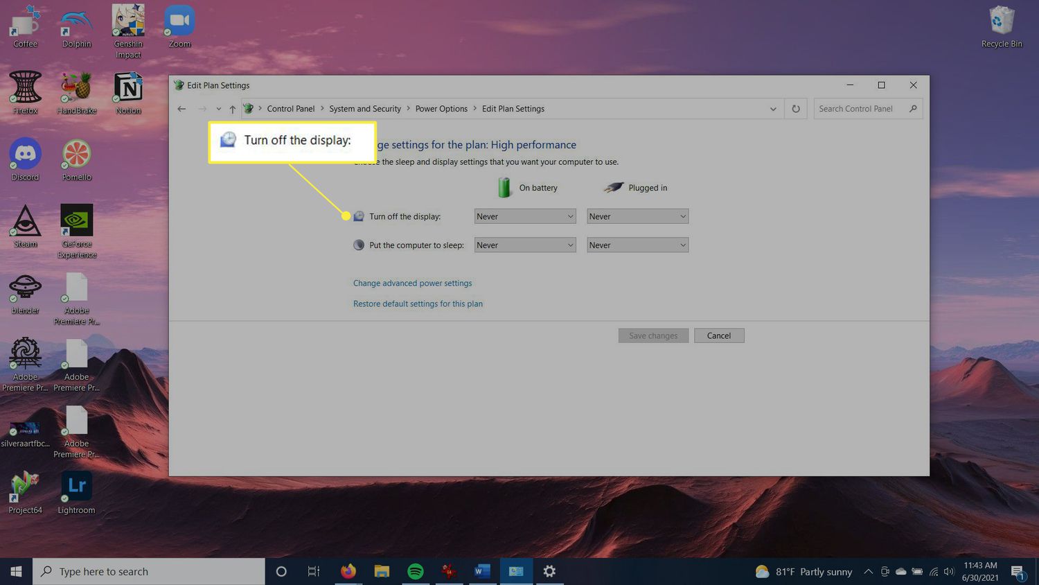 A quicker way to get here in the future is to search Windows for Edit power plan.