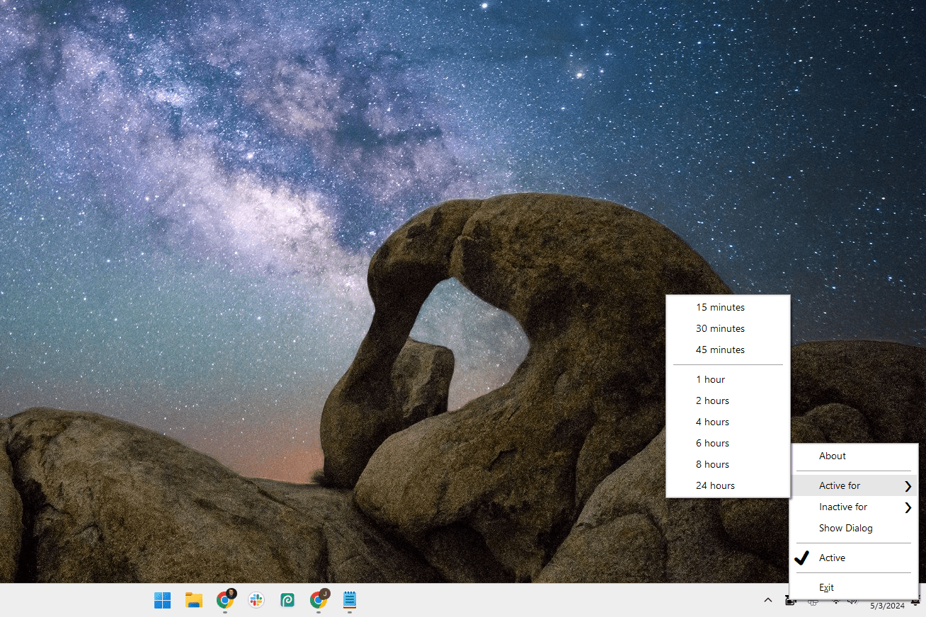 Right-click the program's icon near the clock to edit how long Caffeine keeps your computer awake. This is also how you exit the app.