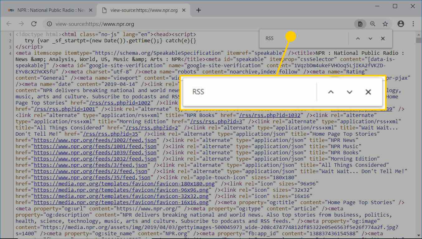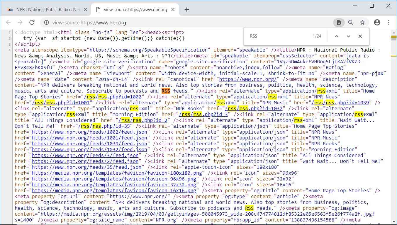 If you don't see the RSS icon or link, examine the page source of the web page. Here's how to view the page source in Chrome and get an RSS link.