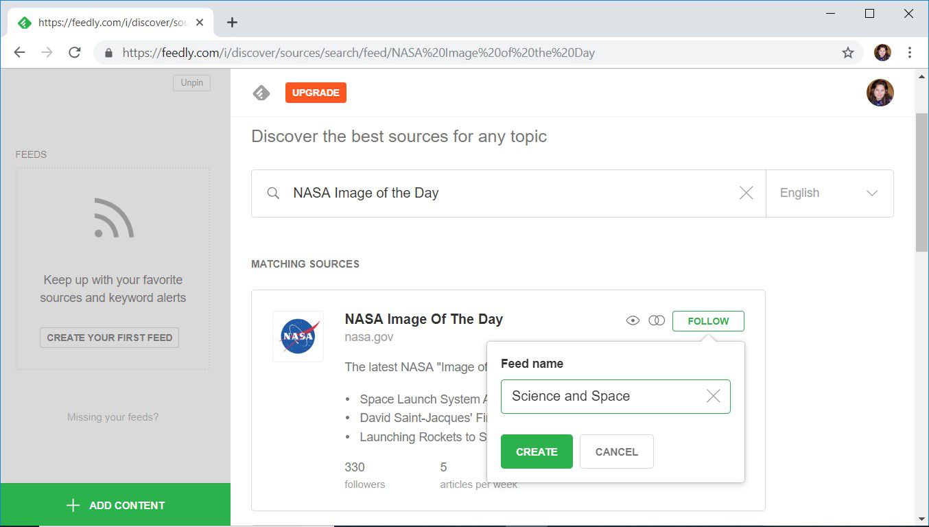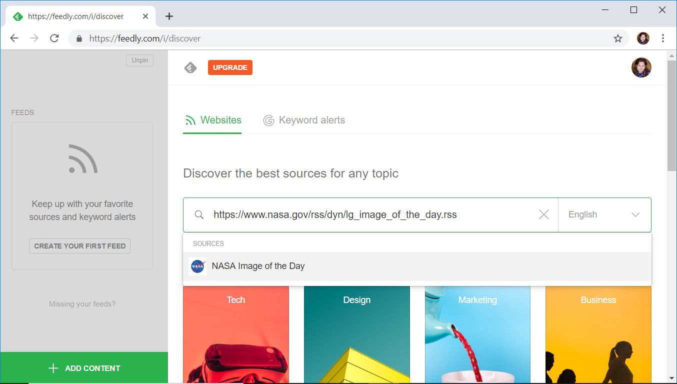 Paste the URL in the Feedly Search box and select the RSS feed from the list of sources.