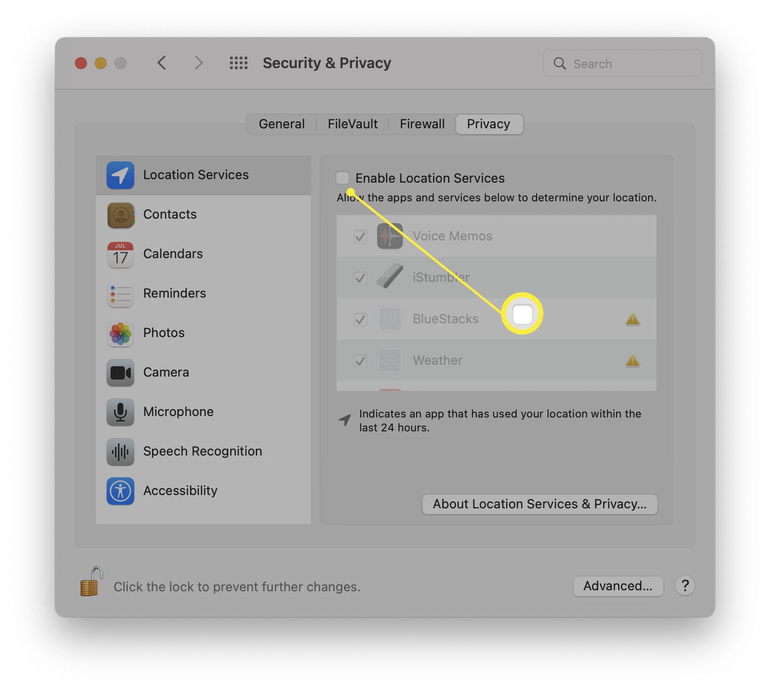- Change which apps can use Location Services by checking/unchecking the box next to the app's name.