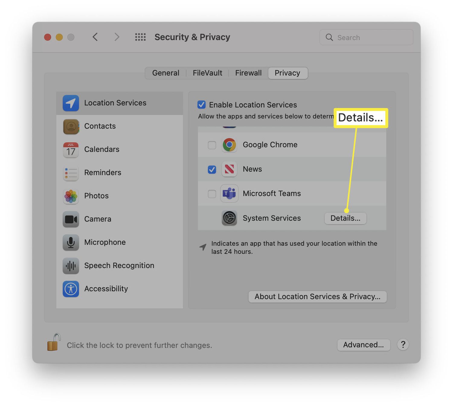 From the Location Services section of Security & Privacy, click System Services > Details.