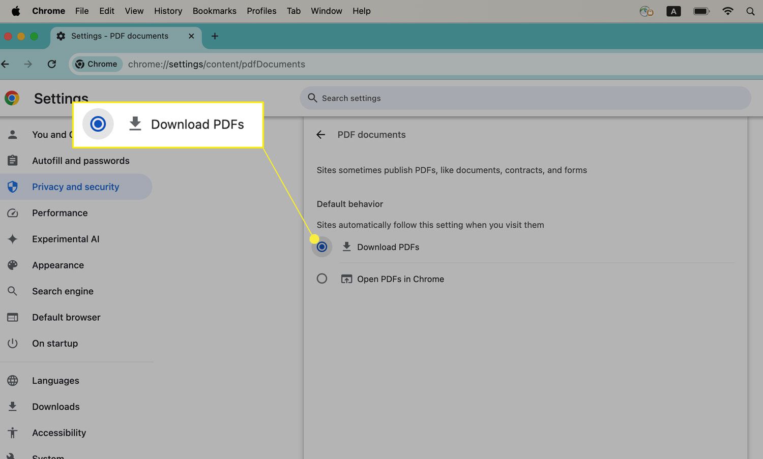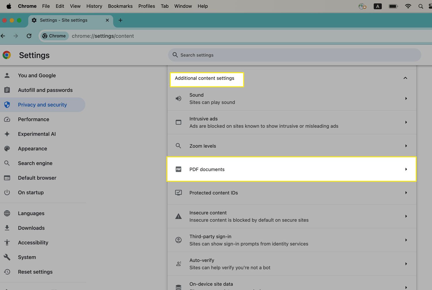 - Choose Settings > Privacy and security > Site Settings > Additional content settings > PDF documents > Download PDF files.