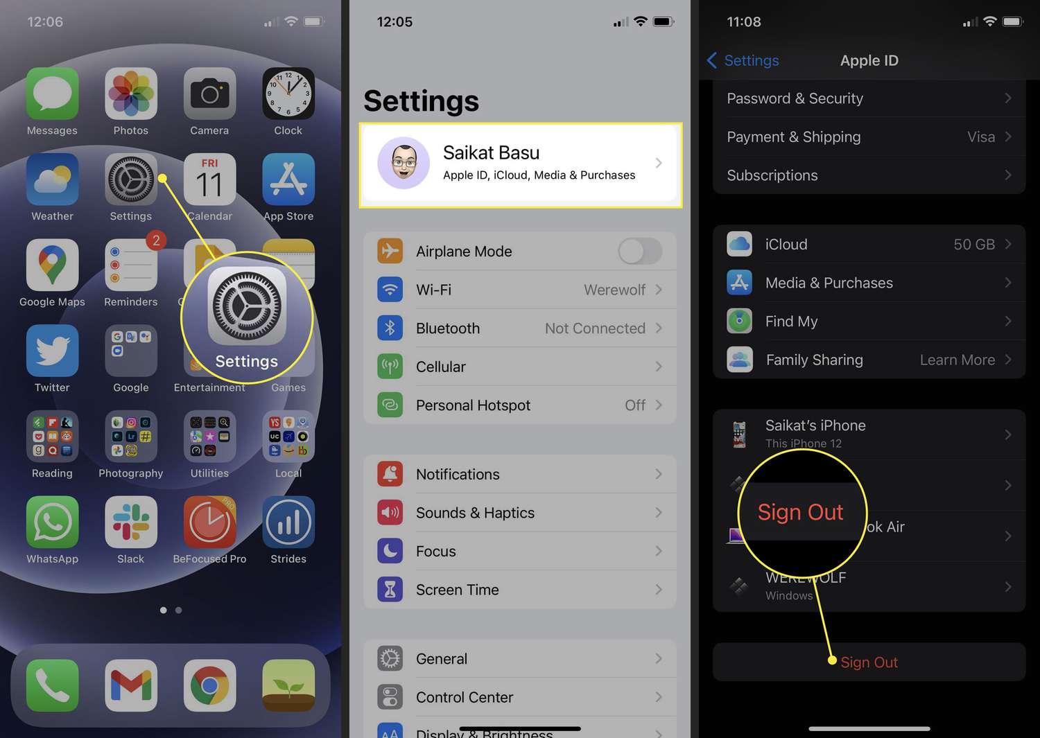 Tap your name at the top of the Settings options.