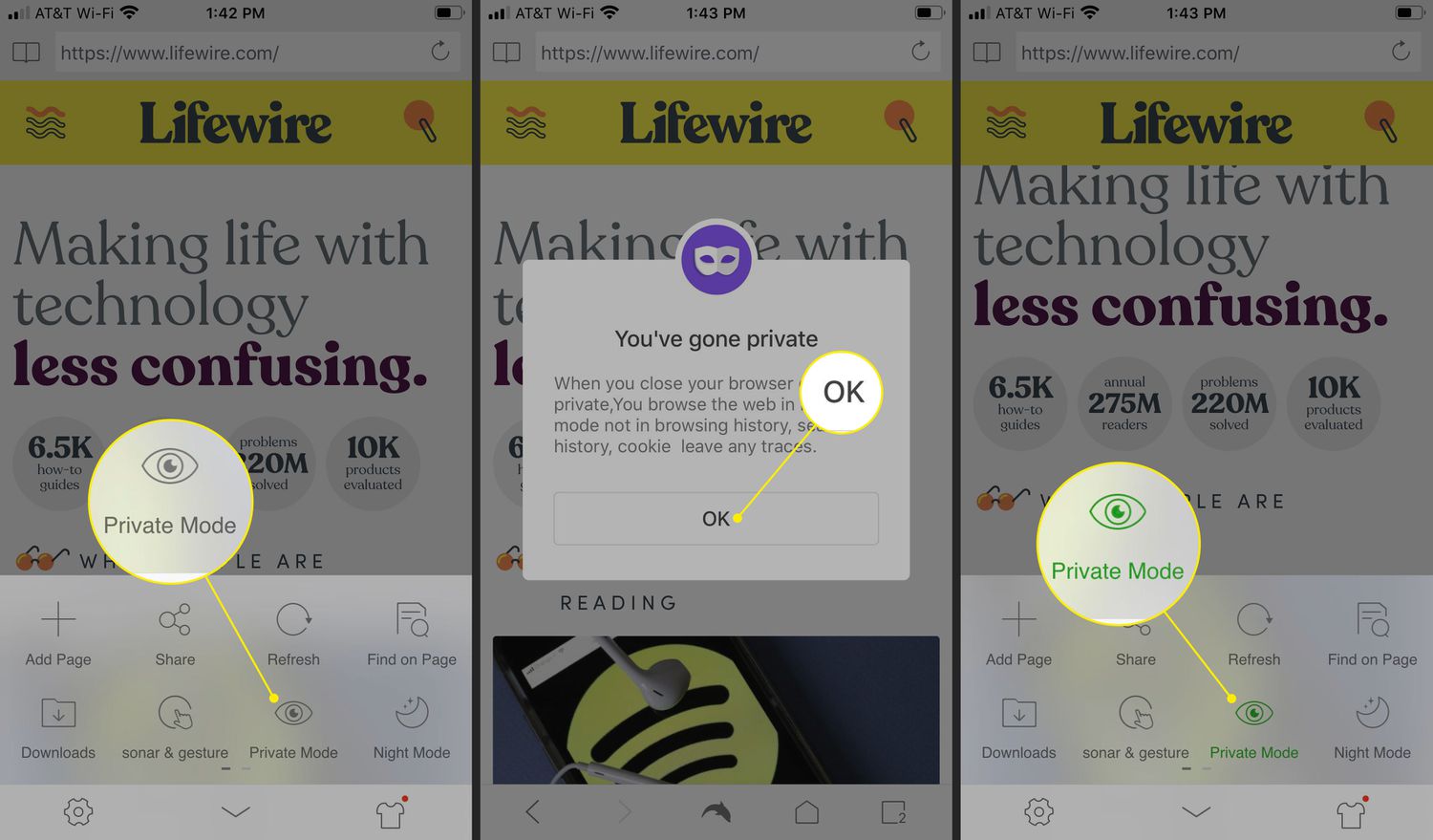 Select Private Mode to prevent Dolphin from saving browsing activity to your device. When activated, browser history, cookies, cache, and login credentials aren't saved. Tap Private Mode again to go back to normal.