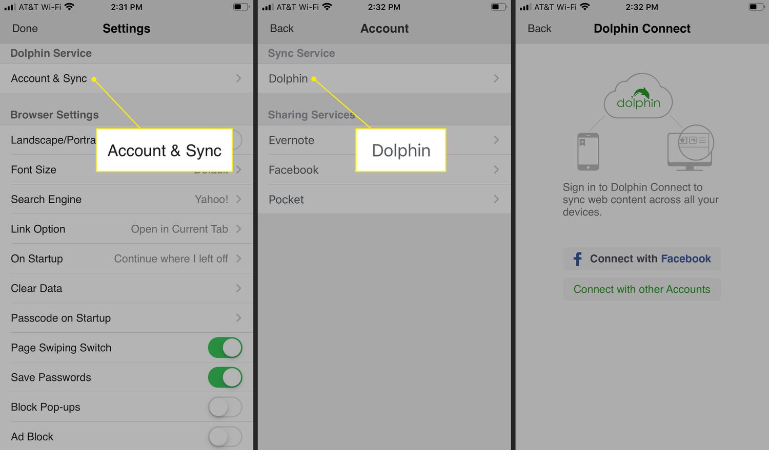 Under Dolphin Service, you'll find Account & Sync. Tap Account & Sync to synchronize content and settings across all devices that run Dolphin using the cloud-based Dolphin Connect service.
