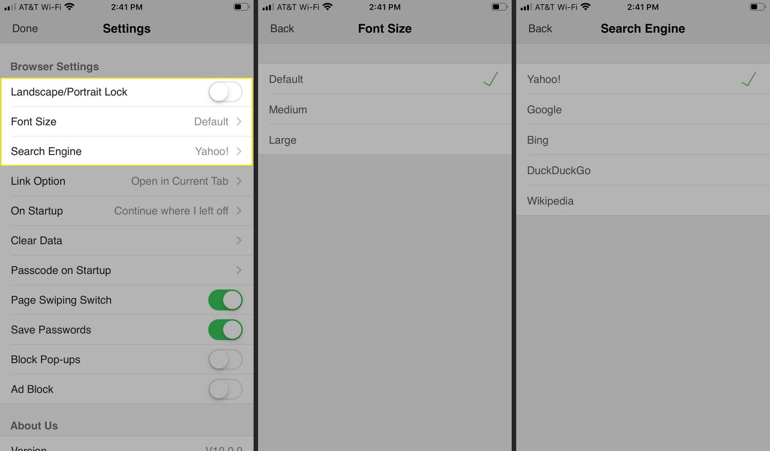 Under Browser Settings, you'll find options for enabling Landscape/Portrait Lock so that you can lock one view in the browser. Tap Font Size to set Default, Medium, or Large fonts. Tap Search Engine to set your default search engine choice, choosing from Yahoo!, Google, Bing, DuckDuckGo, or Wikipedia.