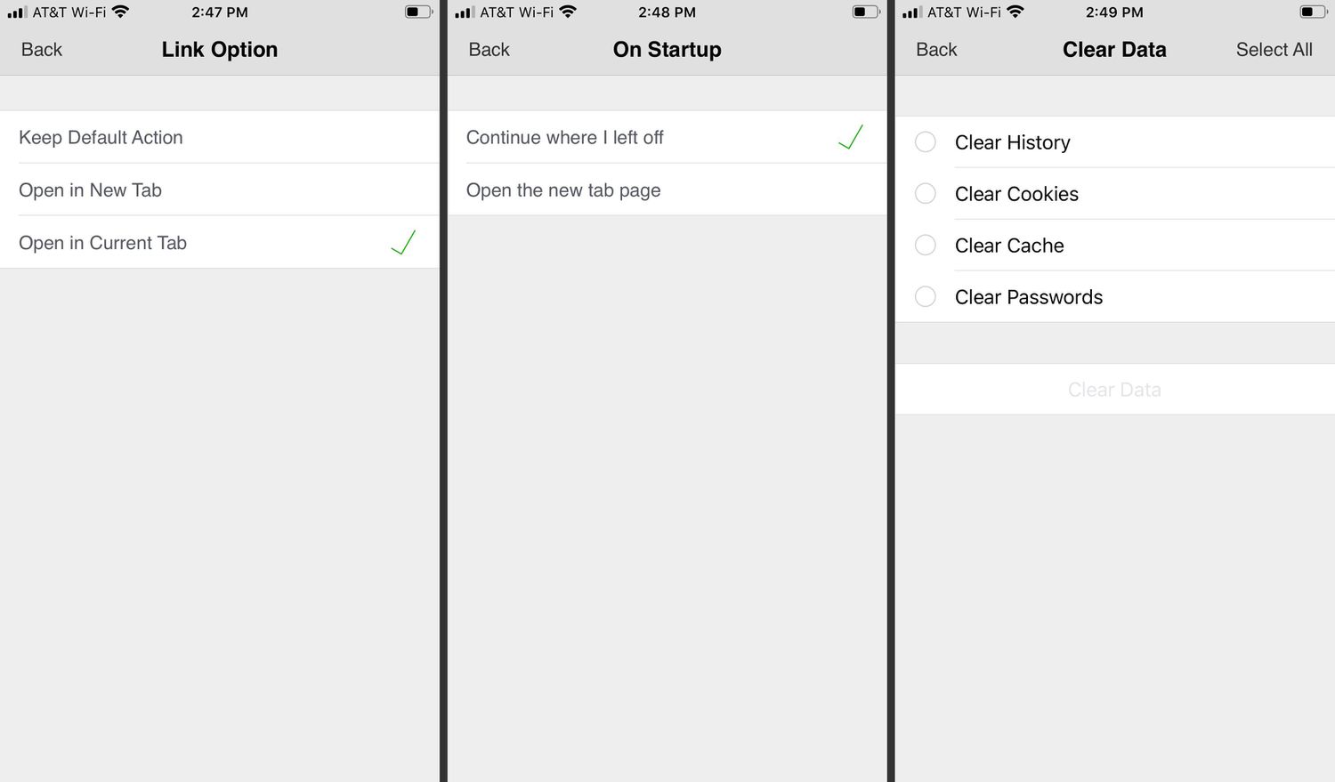 Also under Browser Settings, tap Link Option to choose to open links in a new tab or the current tab, or keep the default action. Tap On Startup to start up where you left off or open the new tab page. Tap Clear Data to clear your browsing history, cookies, cache, and passwords.