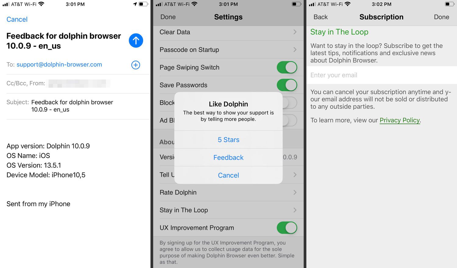 The final section, About Us, displays the Dolphin version number. Tap Tell Us What You Think to open an email box for sending feedback to the Dolphin support team. Tap Rate Dolphin to give the app five stars on the app store or provide feedback via email. Tap Stay in The Loop to subscribe to the Dolphin email newsletter.