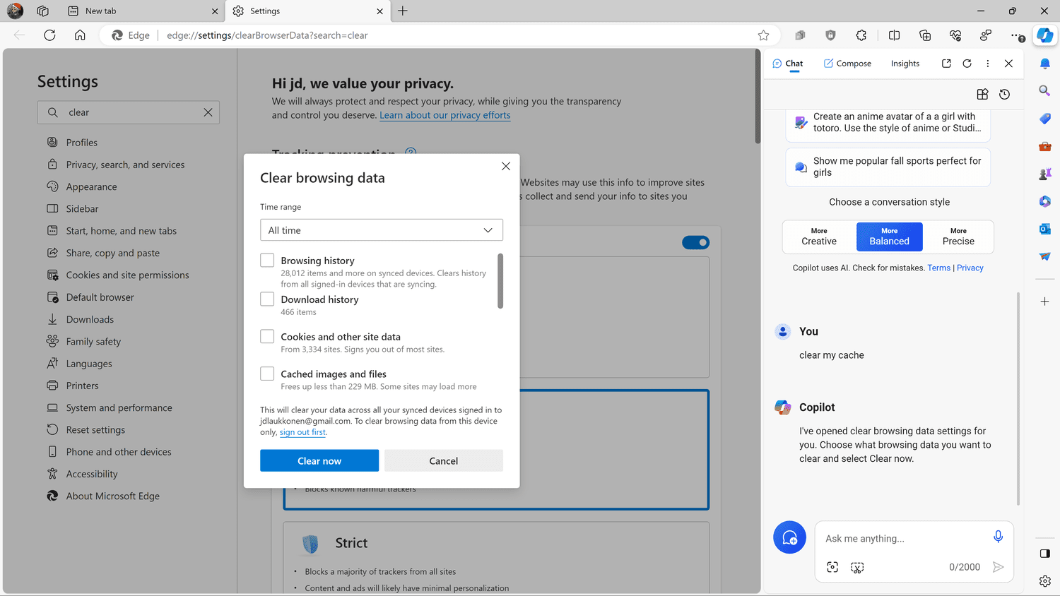 If you ask it to change a setting or perform a function it doesn't have access to, Copilot will open the relevant options or settings page and provide instructions. For example, if you ask Copilot to clear your cache, it will open the clear browsing data screen and tell you to click the clear now button.