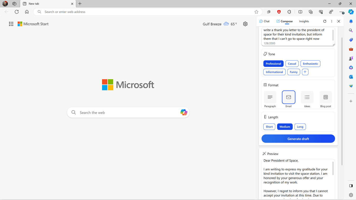 The compose feature provides options designed specifically for generating text, with tone, format, and length options. It helps generate a rough draft if you aren't sure where to start.