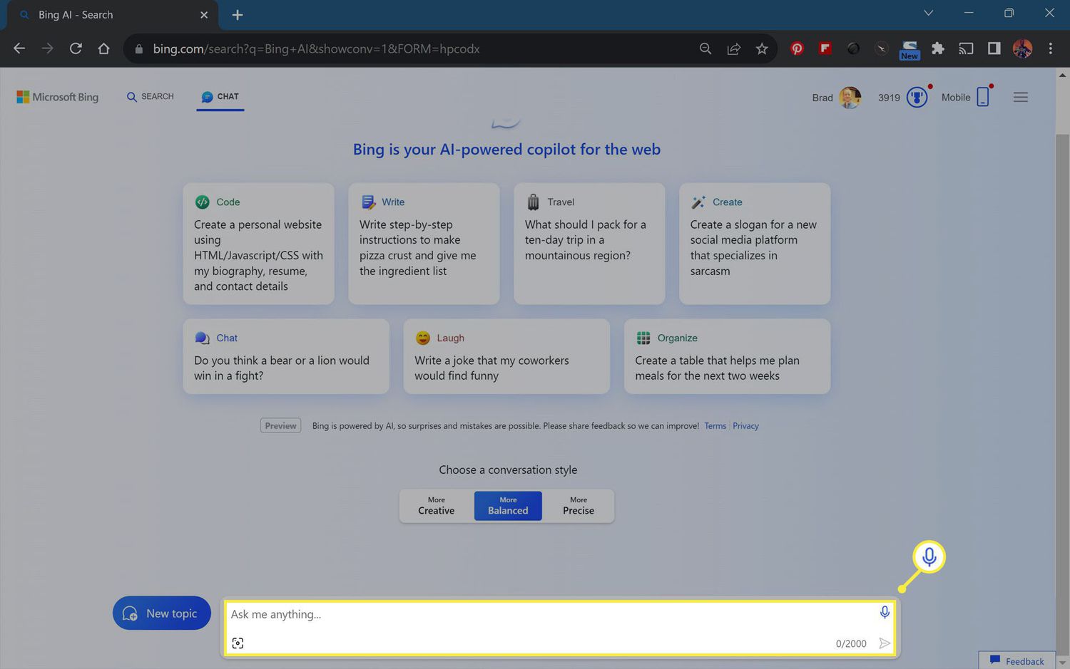 - Select Use microphone to talk to Bing AI with your computer's mic, or use the text field to type a request.