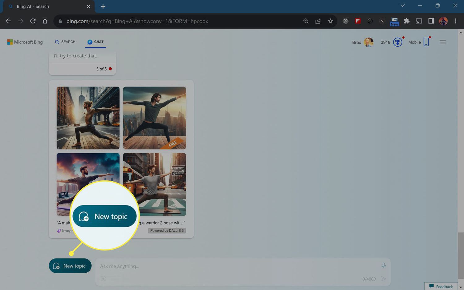 To start a new conversation with Bing AI, select New topic.