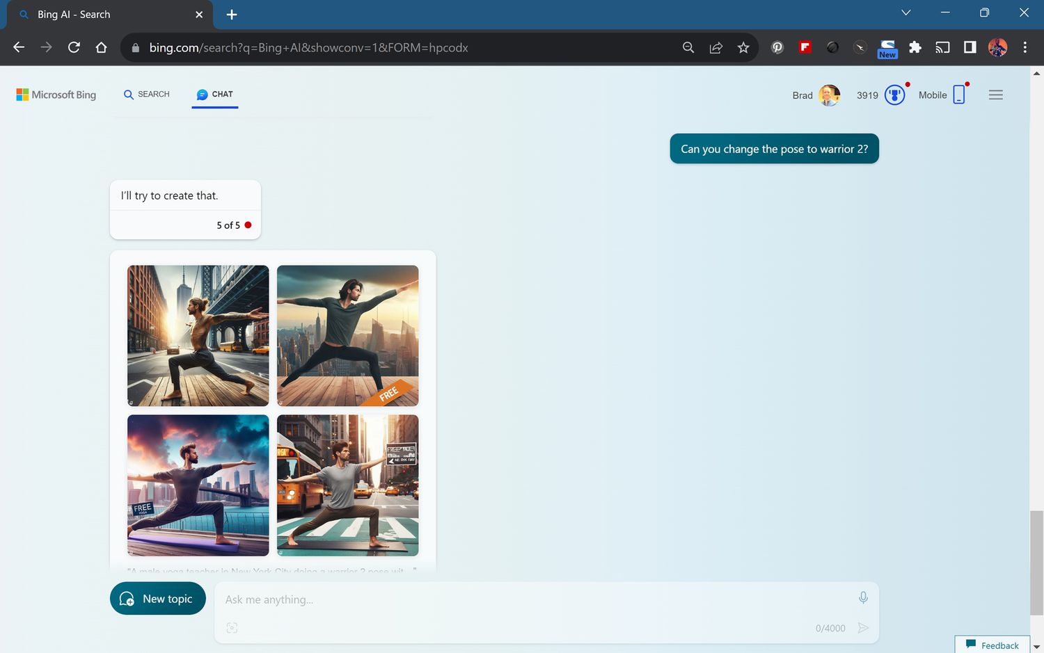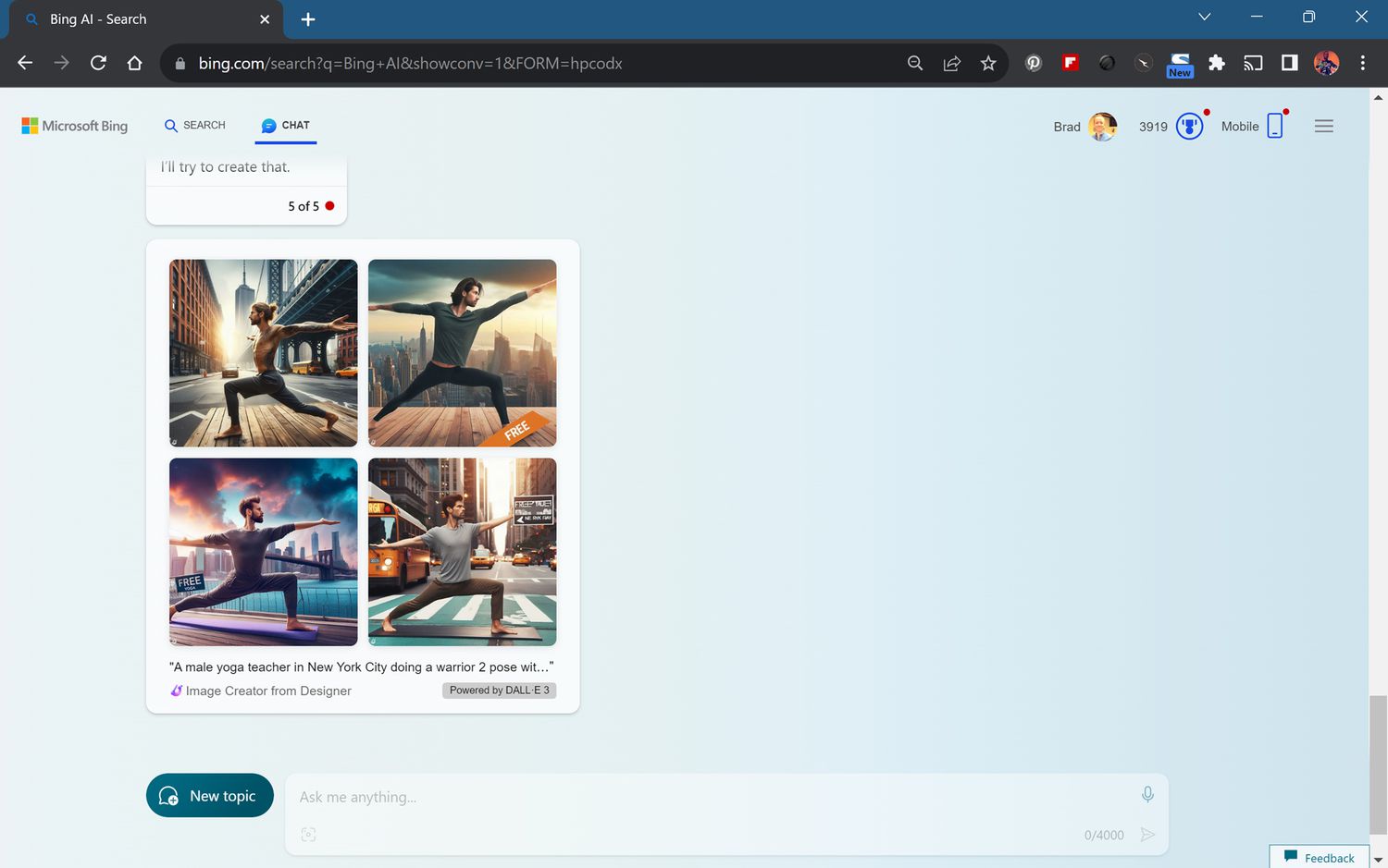 While Bing AI works in the Google Chrome browser, the number of interactions or requests it allows per conversation is limited to five. This can be frustrating when you need to make more adjustments to a DALL-E 3 image or fine-tune a composition. This Google Chrome limit remains whether using Bing AI as a guest or if logged in with a Microsoft account.