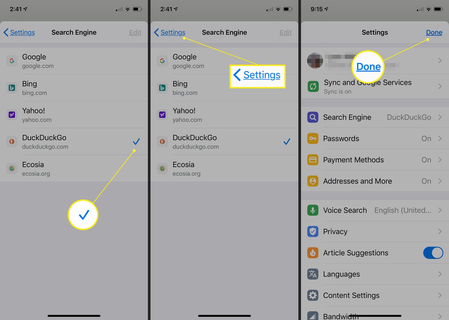 Tap to place a checkmark next to the search engine you prefer. Selections are Google, Yahoo, Bing, and DuckDuckGo in iOS 12 and iOS 11. iOS 13 includes all these plus Ecosia.