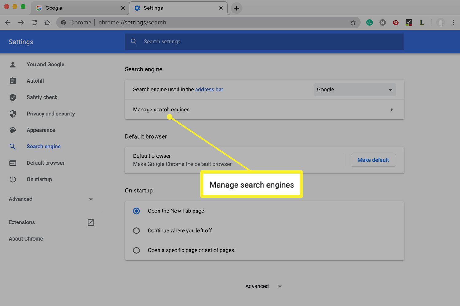 - To change Chrome's default search engine on a PC or Mac, go to menu > Settings > Search Engines > Manage Search Engines.