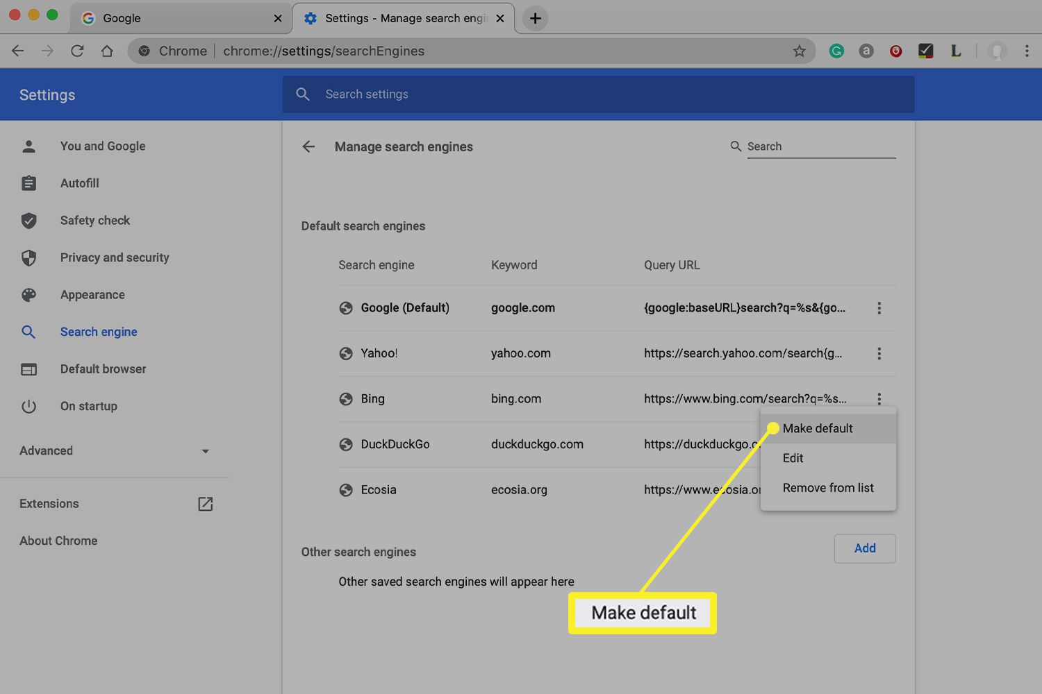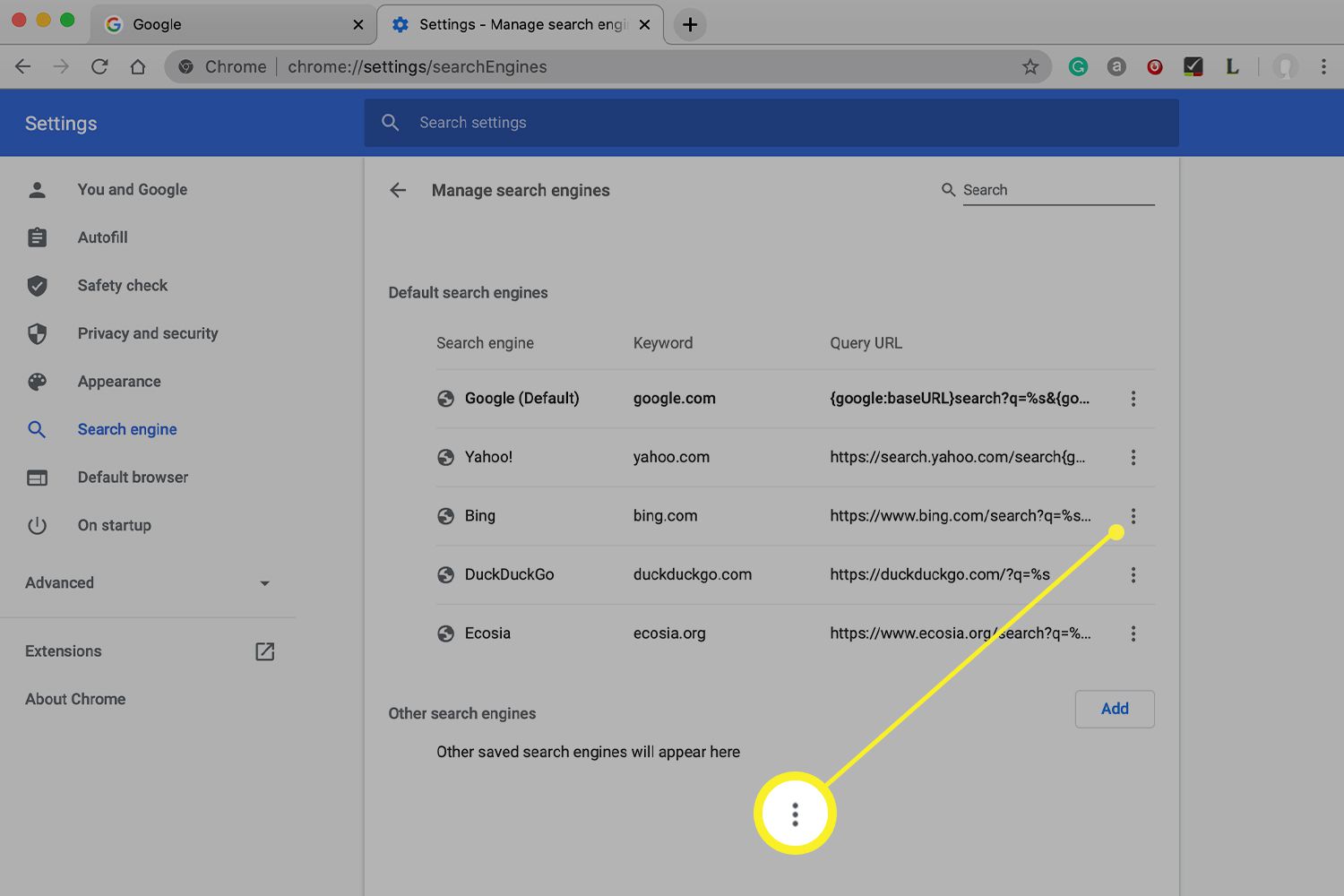 - Tap the Chrome menu button (three dots), then tap Settings > Search Engine. Choose from Bing, Yahoo, DuckDuckGo, or Ecosia.