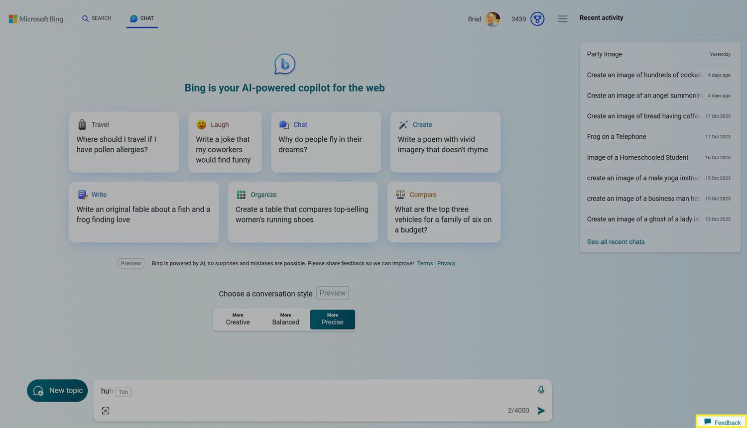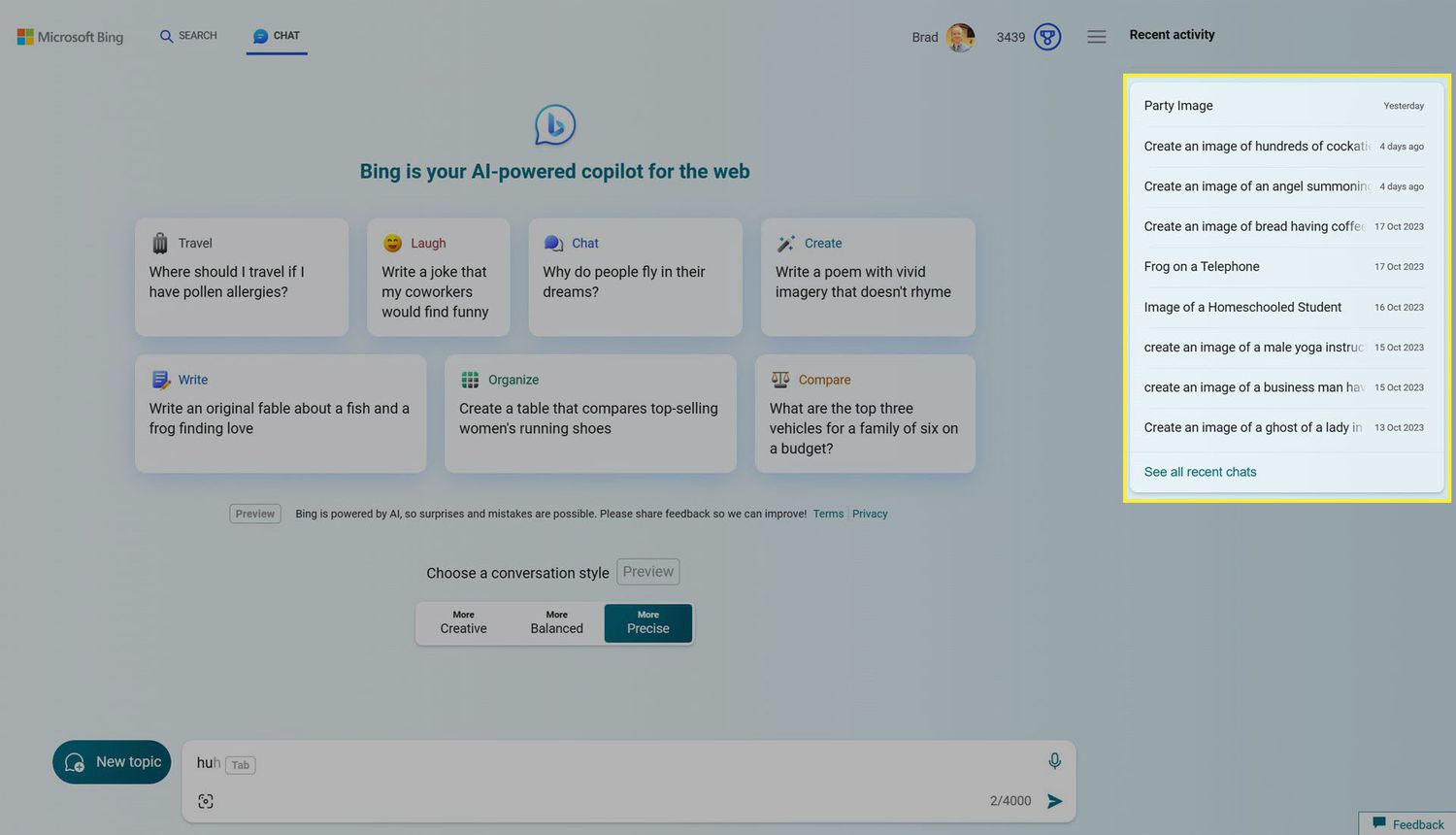 Choose a conversation style. At the bottom of the screen, you'll see three conversation styles. Creative is a more casual and fun conversational style with a healthy dose of emoji while Precise is more formal and business-like, with zero emoji used in the Bing Chat responses. Balanced is a mix of semi-formal and casual dialog with the occasional emoji.