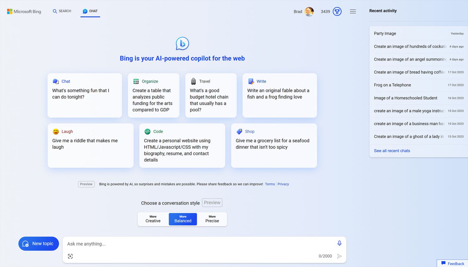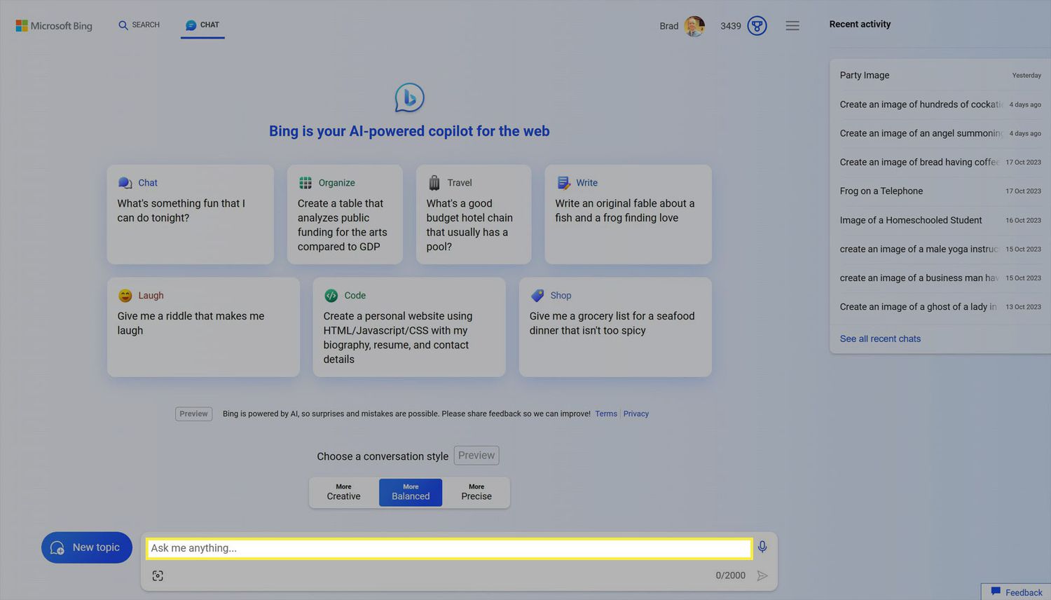 Your requests can be as brief or complex as you like. Ask "What can you do?" to get a list of suggestions, say "Create an image of..." to make an image using DALL-E 3 AI technology, or tell Bing Chat to write you a story, poem, or recipe.