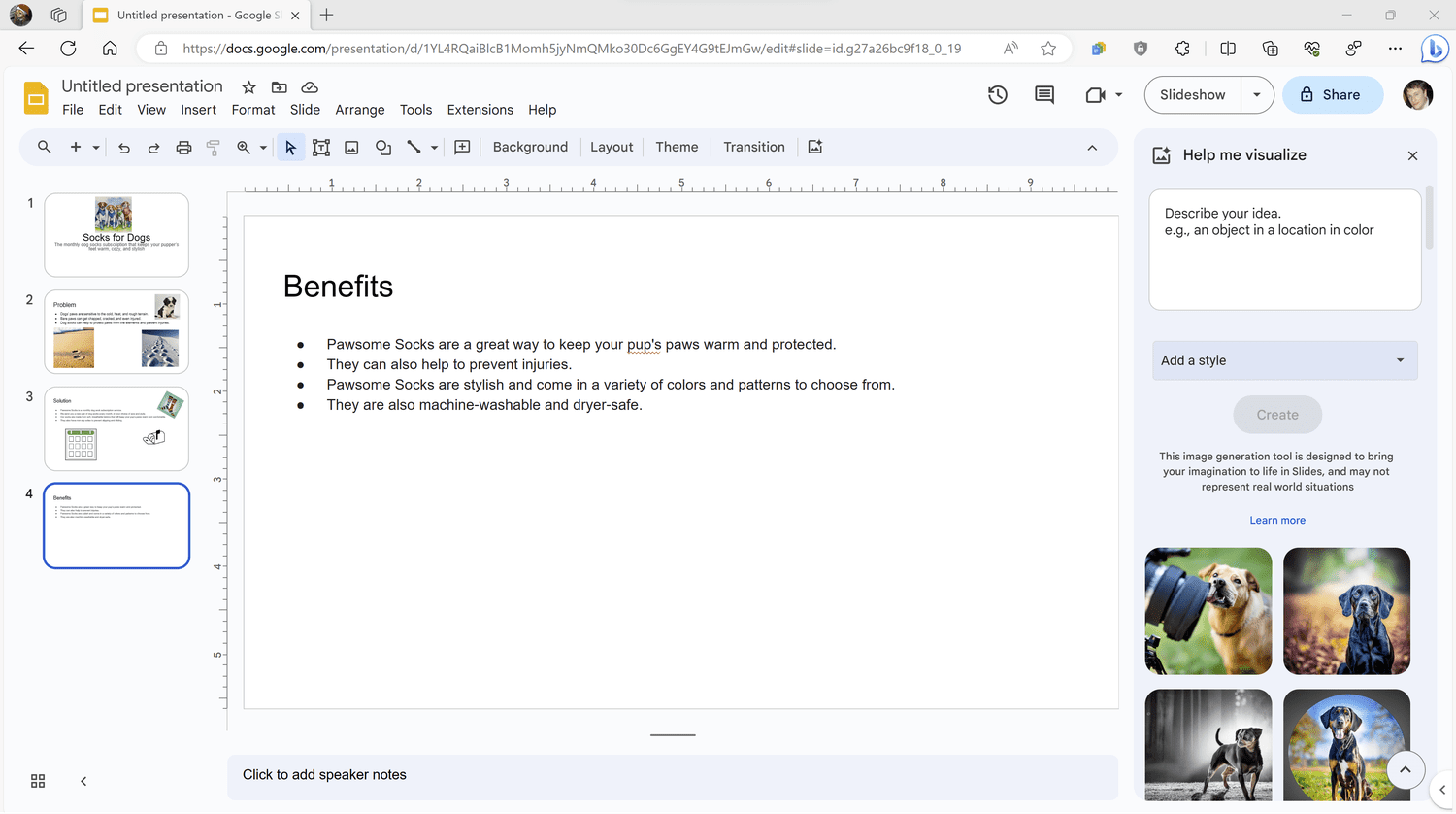 Unlike Gemini, which is only accessible as a standalone chatbot, Duet is integrated and available through various Google Workspace apps. It's capable of helping you write emails in Gmail, documents in Google Docs, and it can generate images for you in Google Slides. It works much like other image-generating AI programs, like Stable Diffusion and Midjourney, in that you type a prompt describing the image you want. Then, the AI generates some variations based on that.