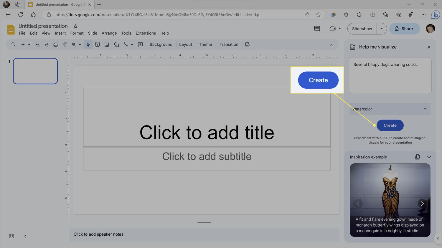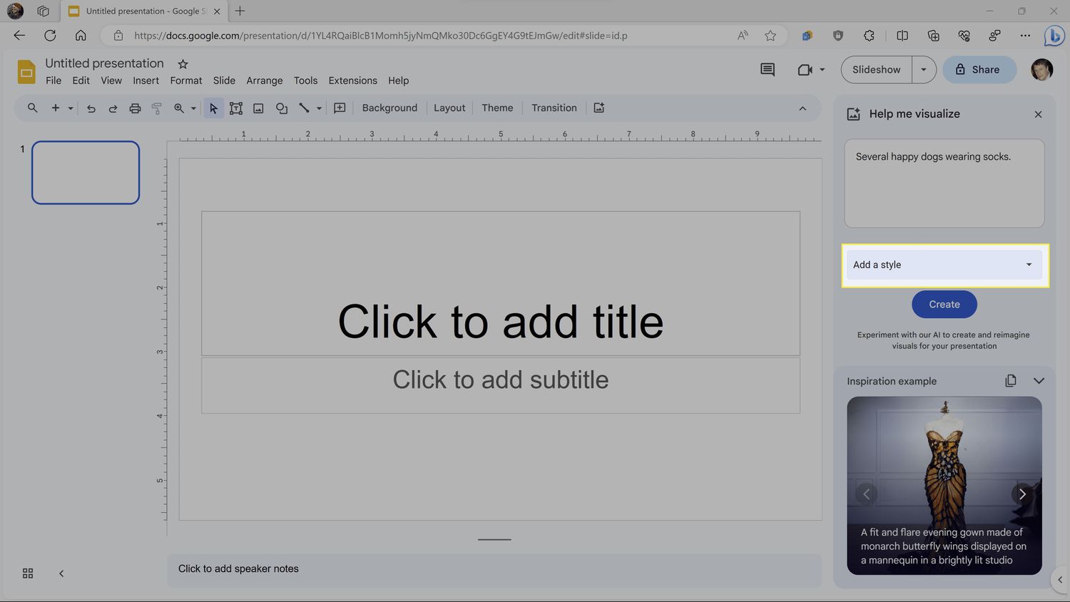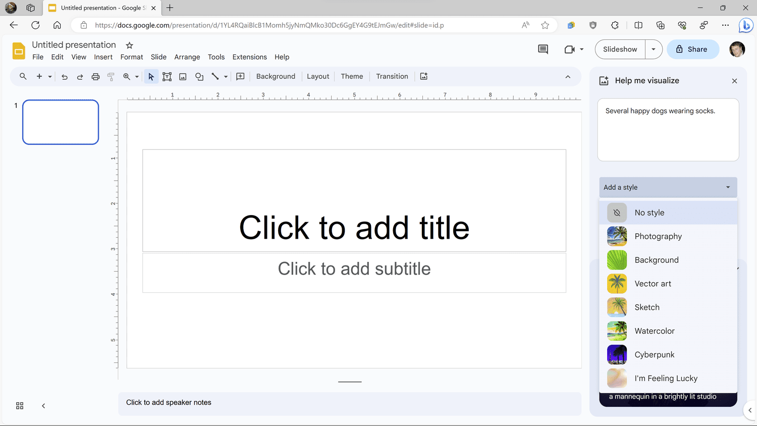 - Type a prompt into the Help me visualize interface, select a style, and click Create.