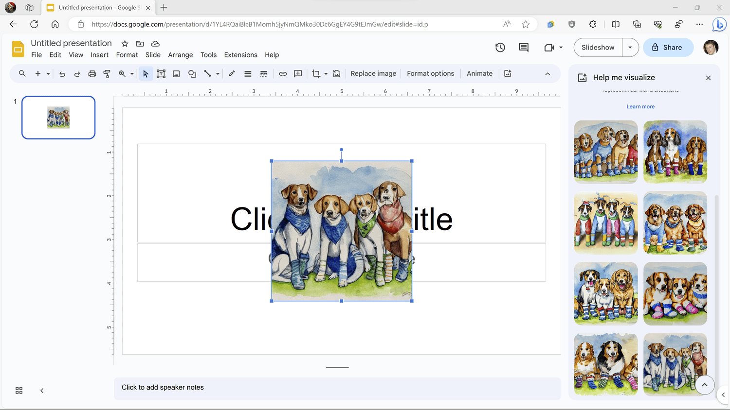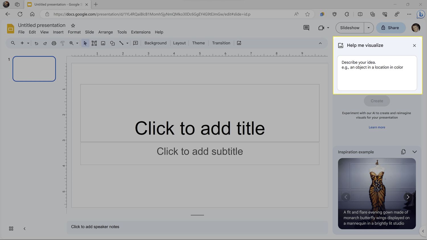 - Create or open a presentation in Google Slides: Insert > Image > Help me visualize if the Duet interface isn't already present on the right side of the page.