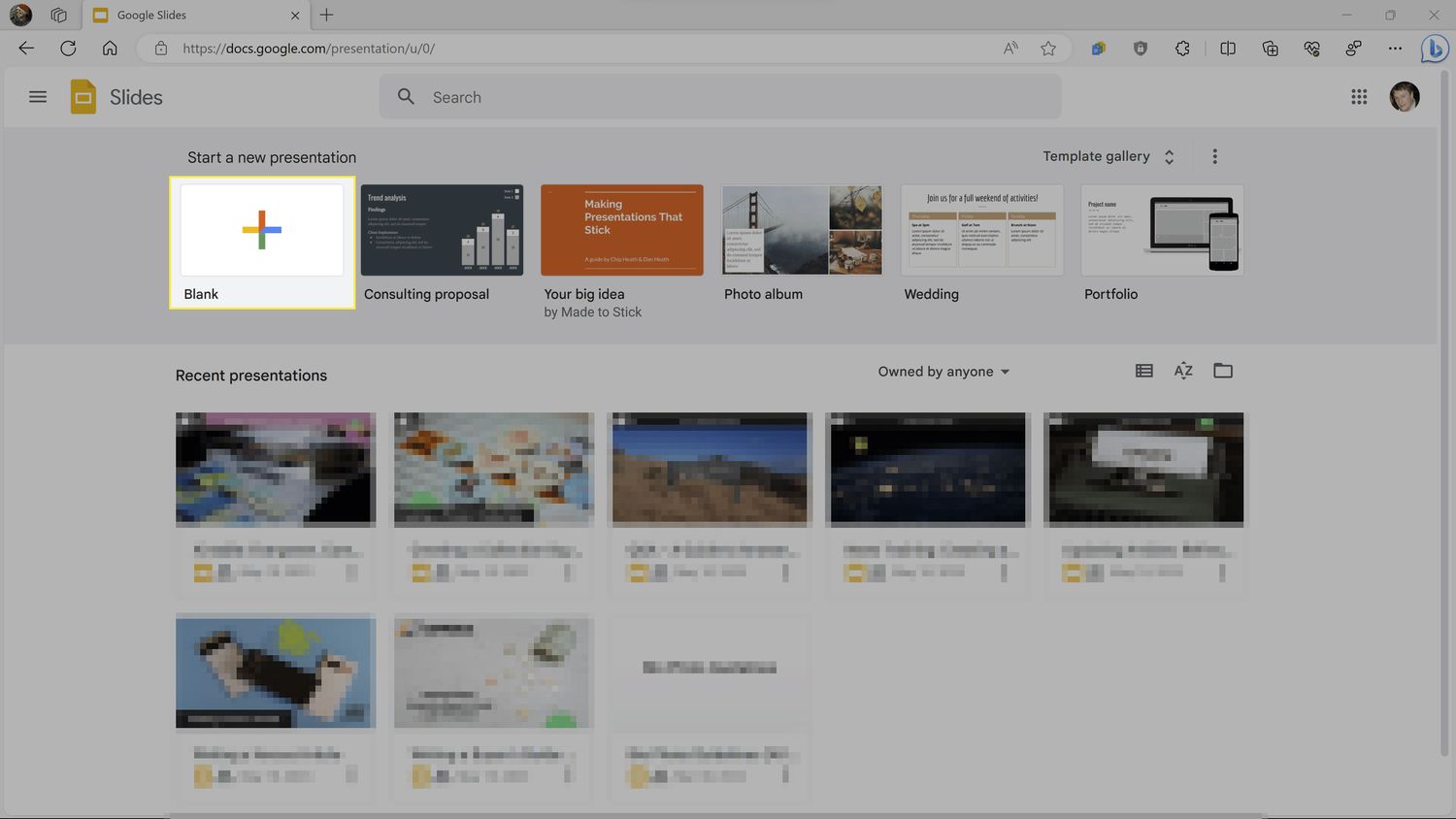 Navigate to Google Slides and click + Blank to start a new presentation.