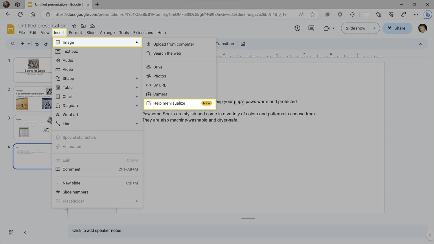 If you don't see the Duet interface when you start a new Slides presentation, click Insert > Image > Help me visualize. If you don't see the Help me visualize option, that means you don't have access to this feature.