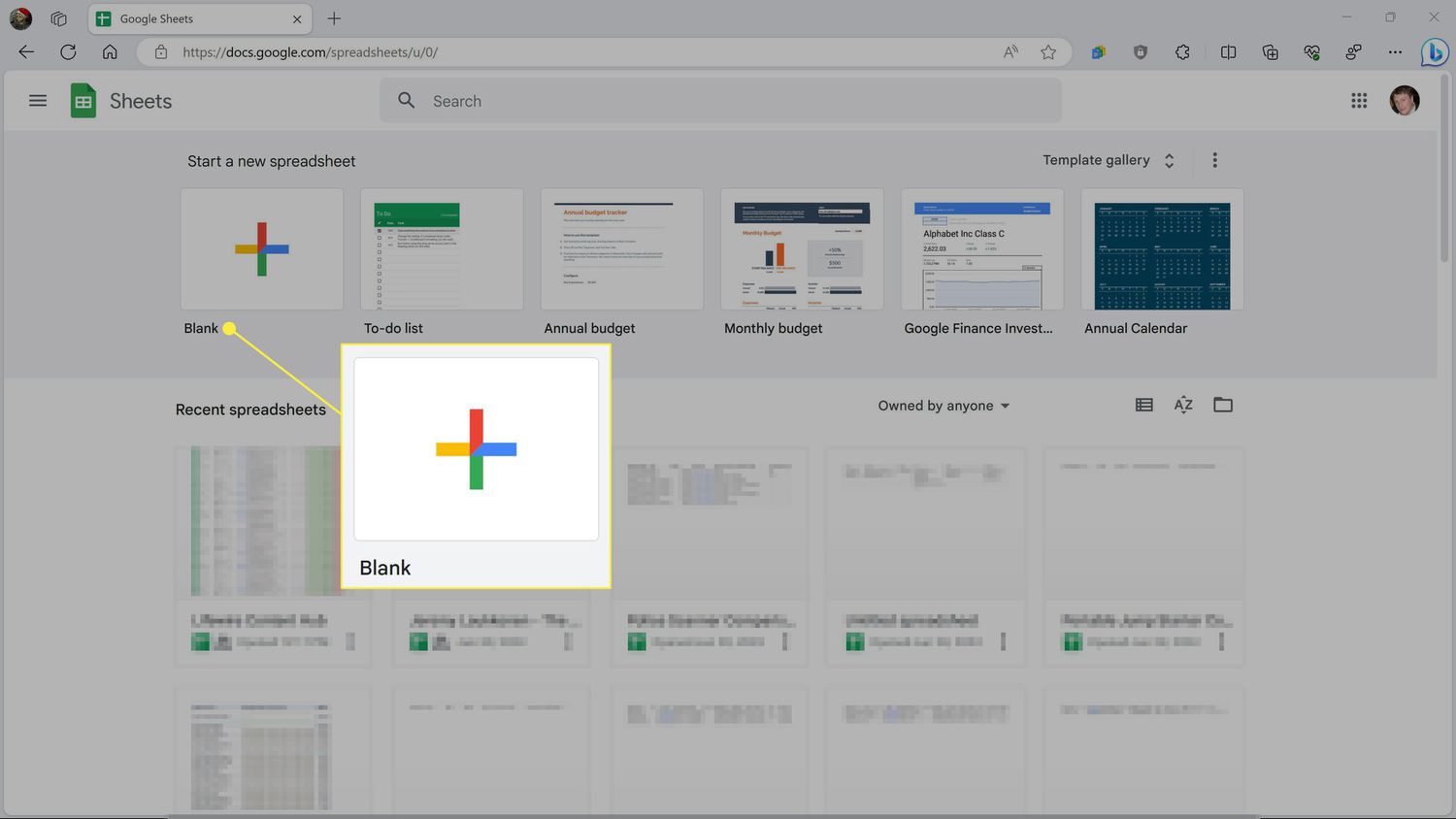 Navigate to Google Sheets, and click + Blank to create a new spreadsheet.