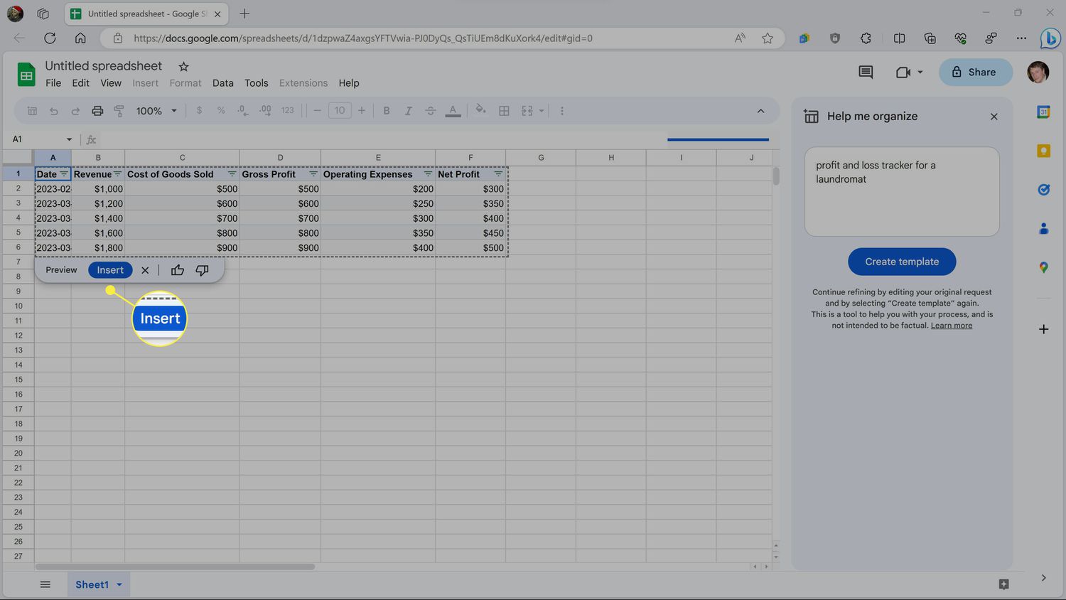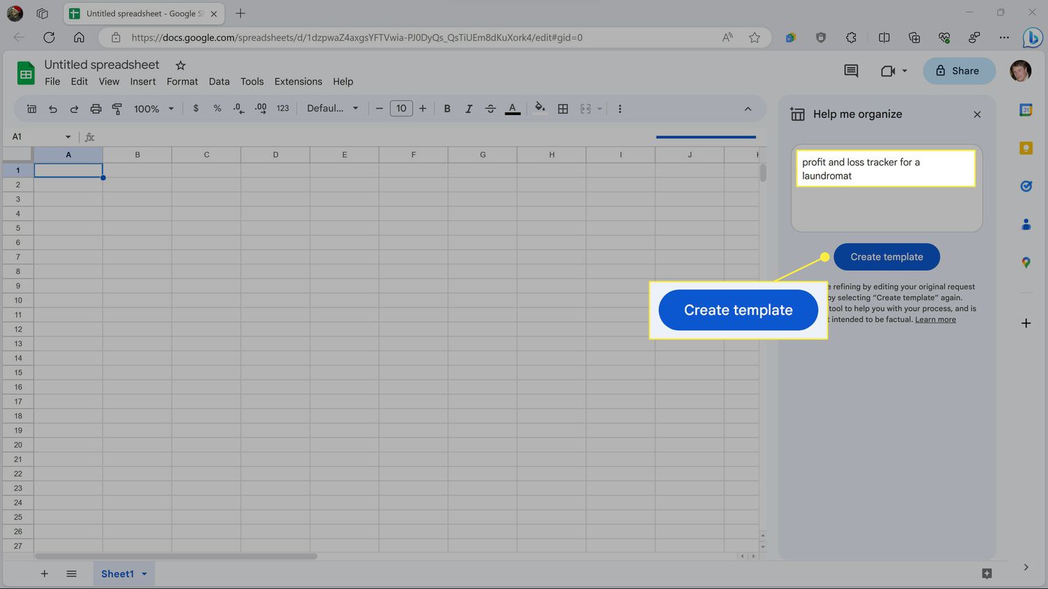 Start by creating a new spreadsheet in Google Sheets. Then type a request, i.e. "profit and loss tracker for a laundromat," and click Create template.