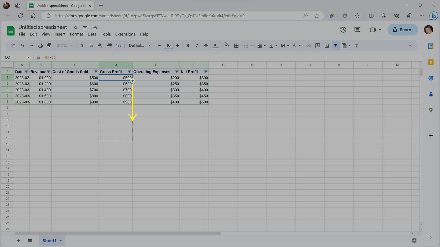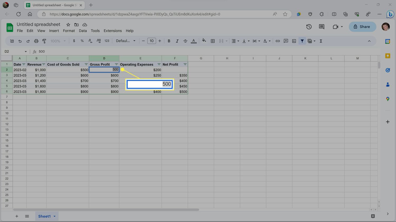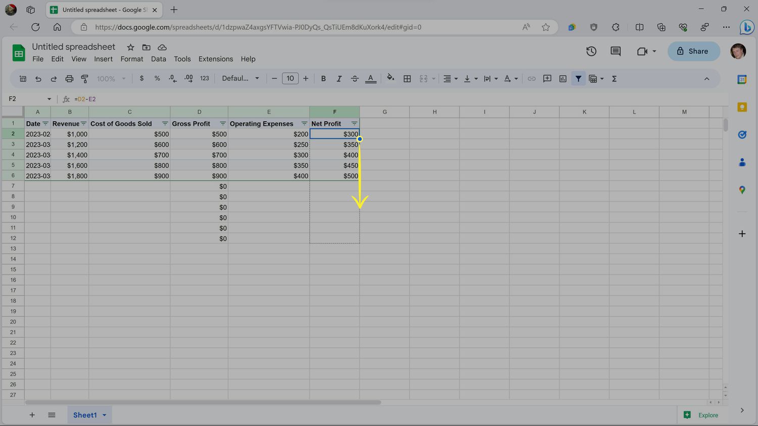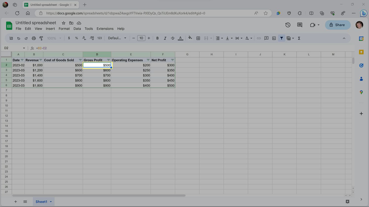 This template is a good start, but it doesn't actually calculate anything. To fix that, highlight the first number in the Gross Profit column and press the = key.