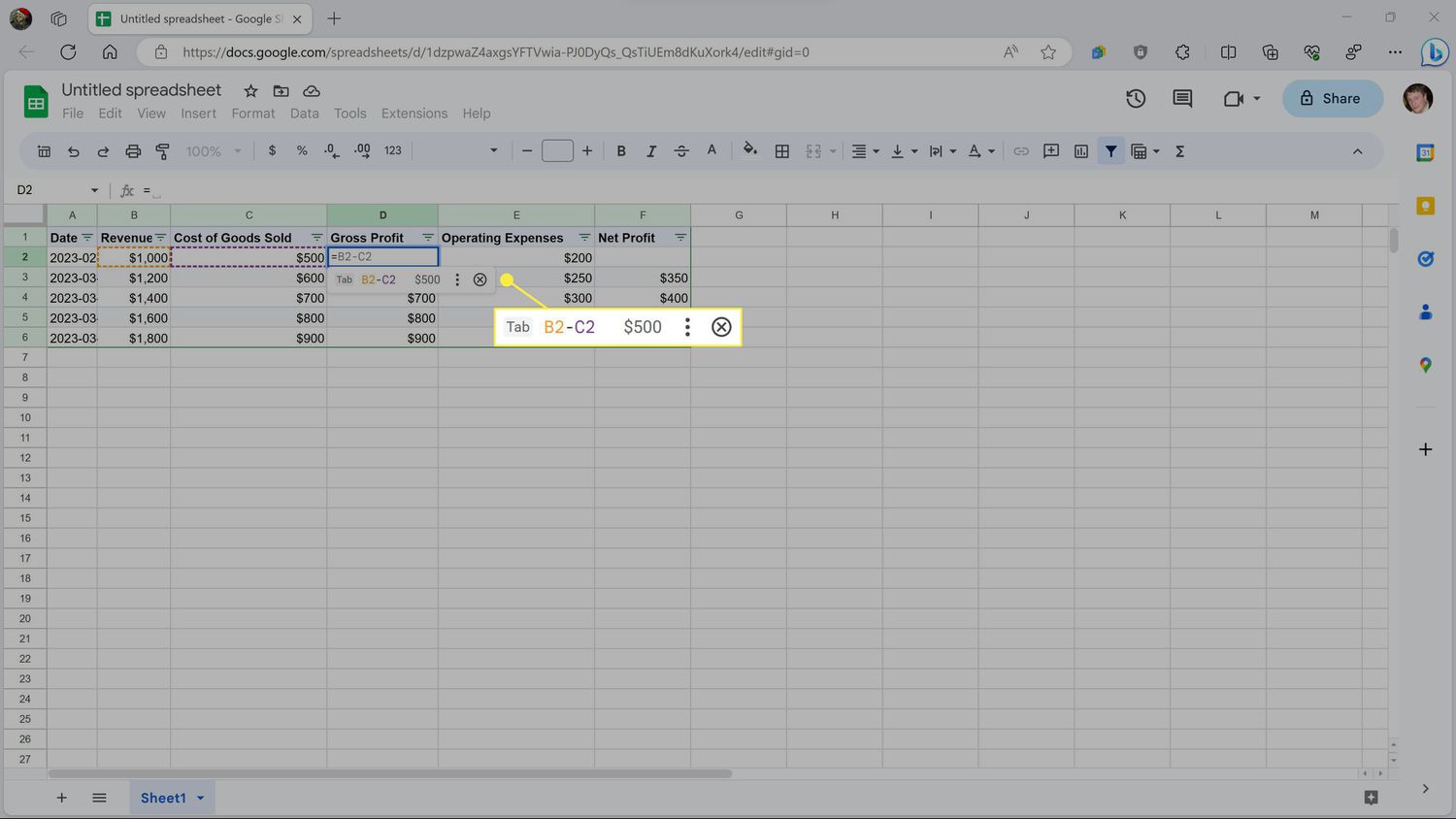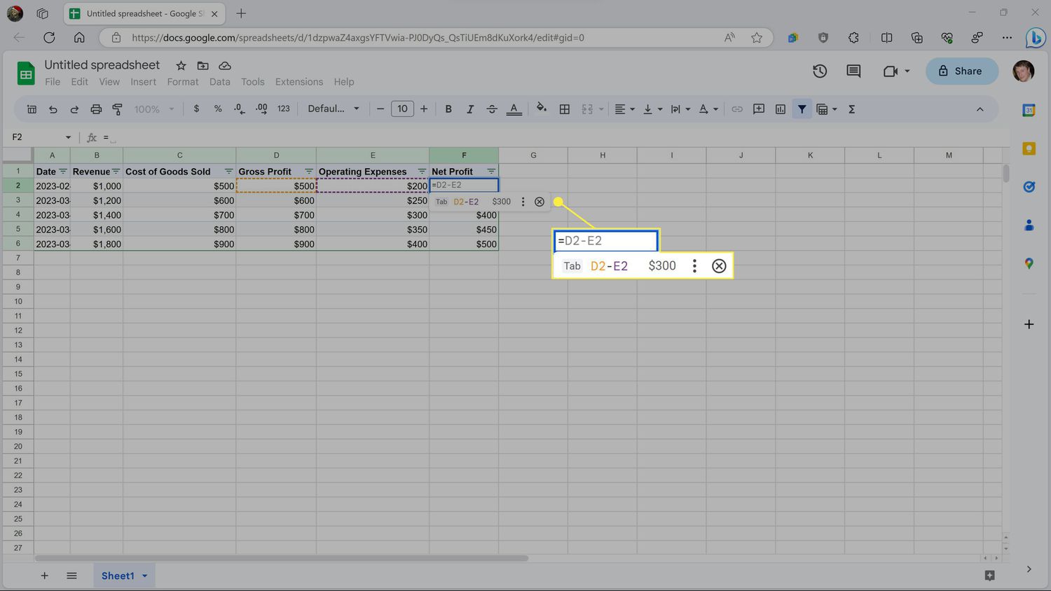 Now do the same thing with the first entry in the Net Profit column. Delete the number from that cell, press the = key, then the back arrow twice. Then click the suggested formula when it appears, or press tab.