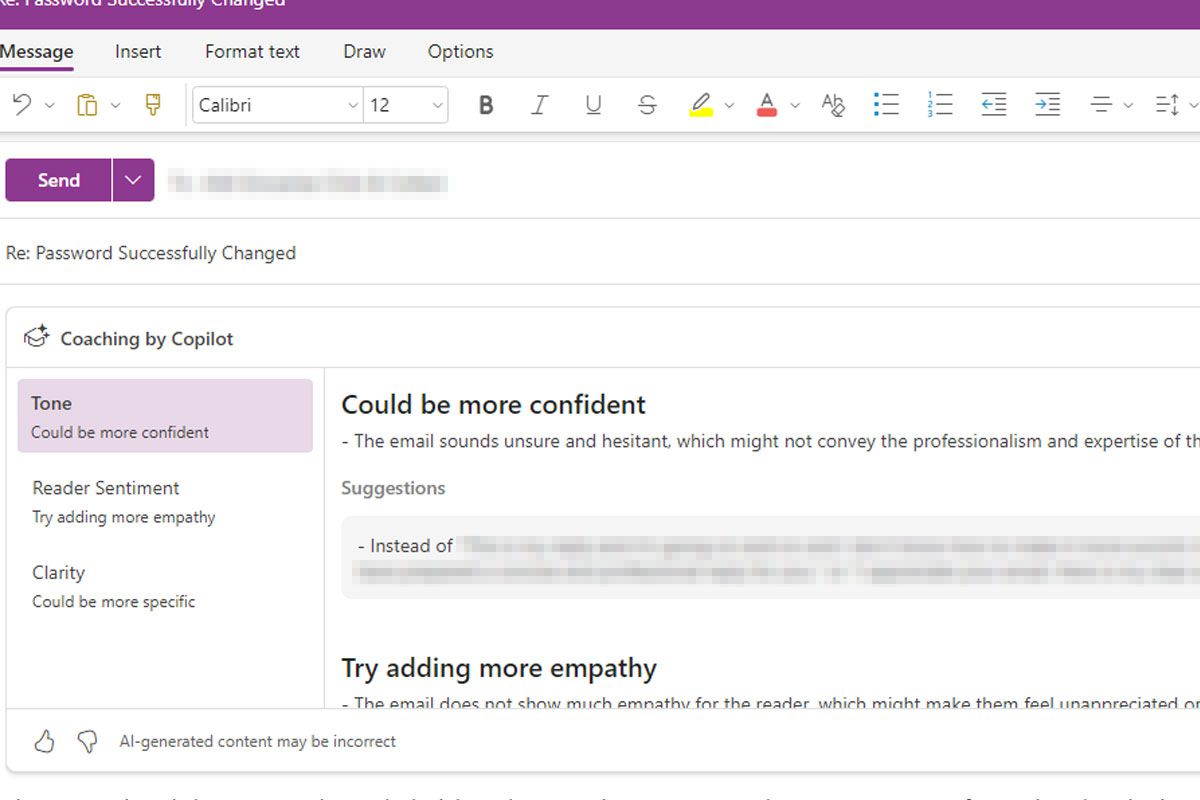 Wait for Copilot to finish its analysis, and then consider its suggestions when it comes to the next draft of your email.