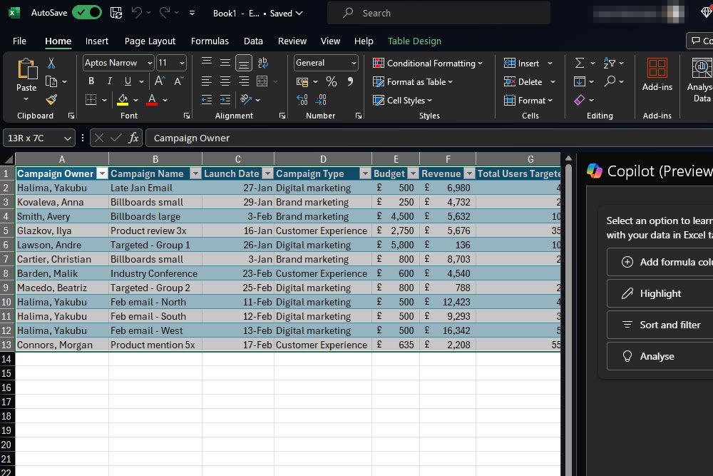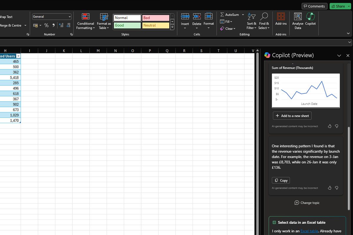 To begin using Copilot in Excel, all you need to do is select the icon, choose the data you want to interact with, and make your request. Here's how to do it.