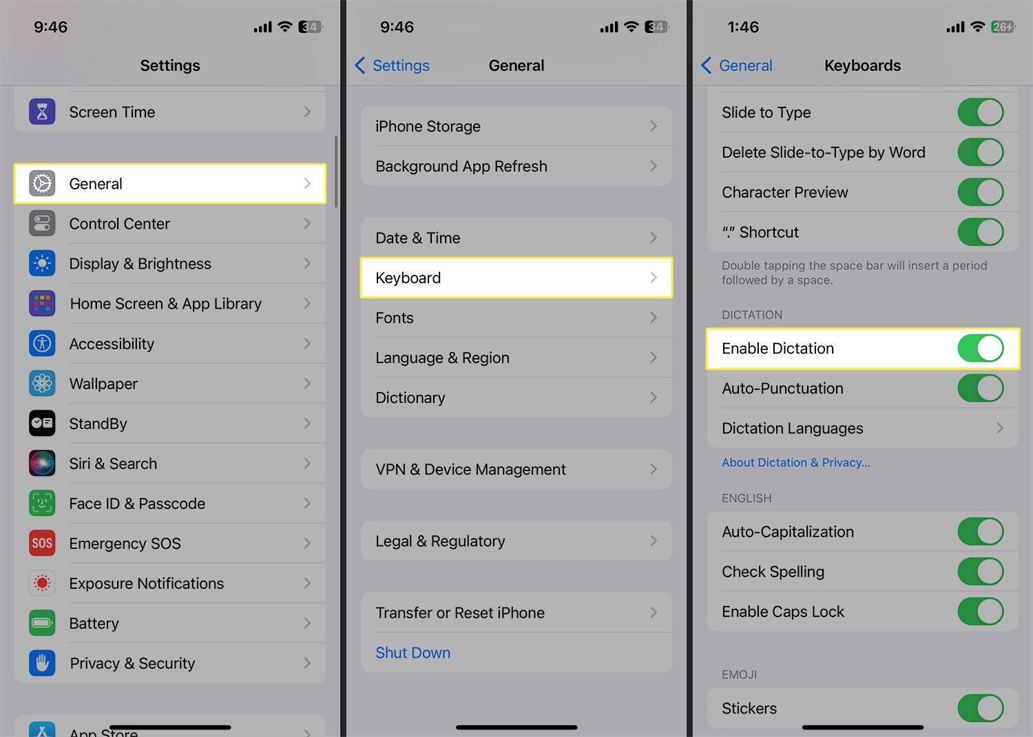 - Go to Settings > General > Keyboard > toggle on Enable Dictation.